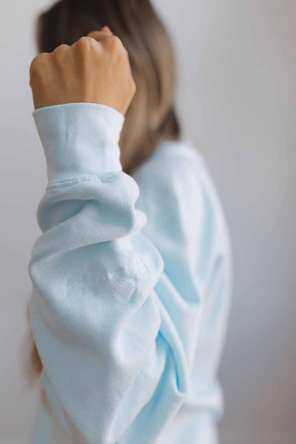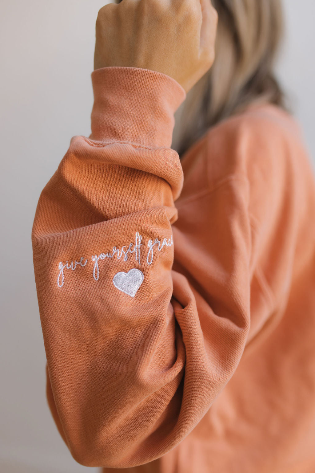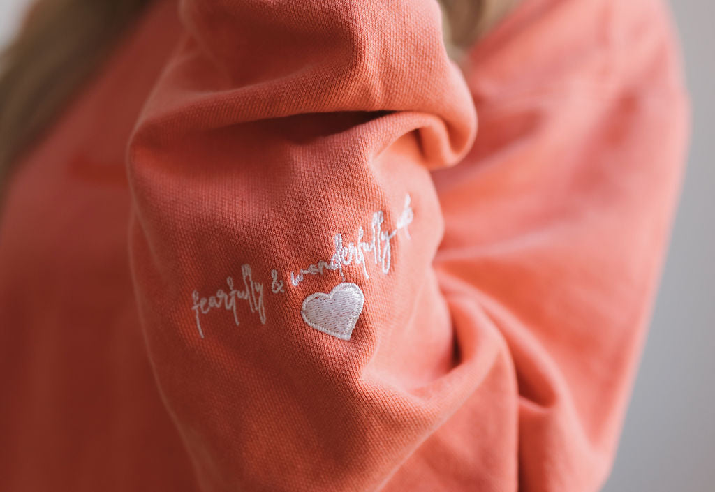 Sleeve embroidery options: 'Give yourself grace' or 'Fearfully & wonderfully made'